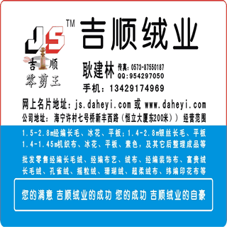 吉顺绒业,吉艾顺绒业,主生产批发零售各种经编长毛绒、经编布艺、绒布、经编装饰布、富贵绒、长毛绒、孔雀绒、摇粒绒、珊瑚绒、超柔绒布、纬编印花布;1.5-2.8m经编长毛、冰花、平板;1.4-2.8m银丝长毛、平板;1.4-1.45m机织布、冰花、平板、素色,及其它后整理成品等,联系手机13429174969 耿建林先生。